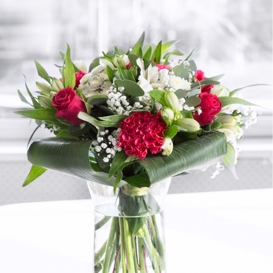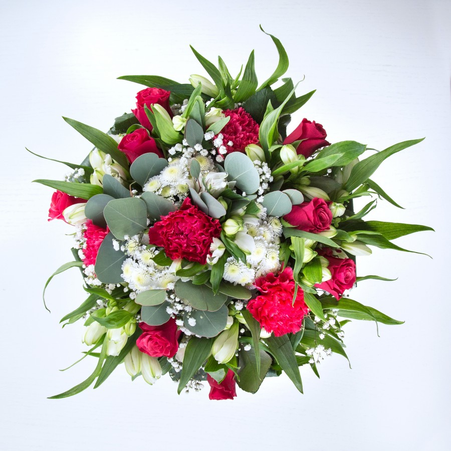 We pride ourselves on the quality and freshness of our flowers, each one hand-selected to ensure a vibrant and long-lasting arrangement. The inclusion of white alstroemeria and aspidistra leaves adds texture and elegance.